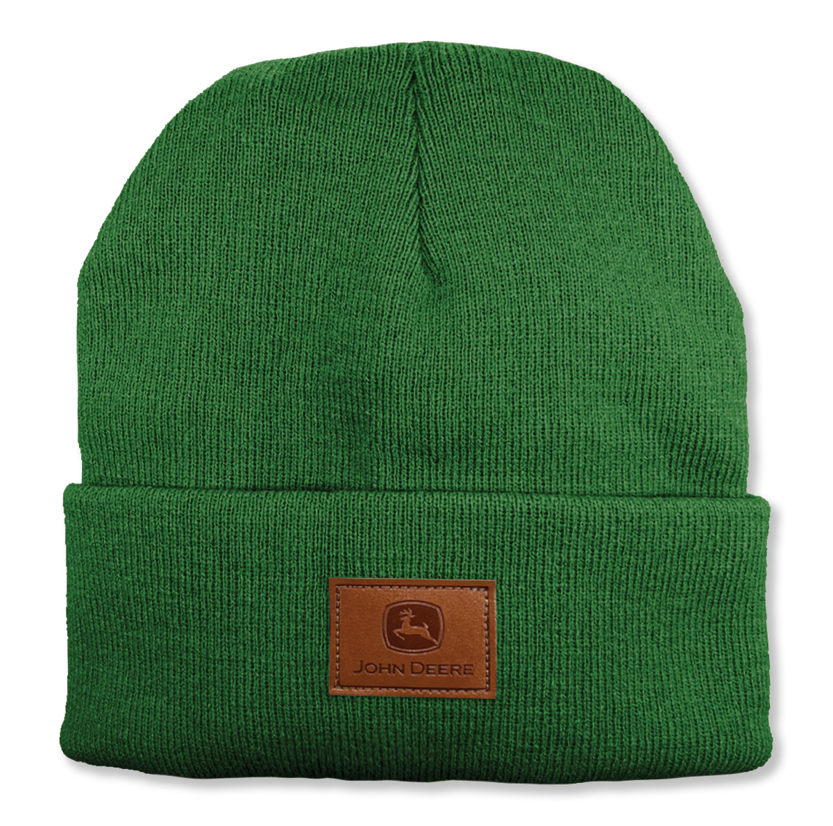 Keep warm in classic John Deere style with this green cuffed knit beanie, featuring a soft 100% acrylic construction and a faux leather John Deere logo patch. A comfortable, durable winter essential for any John Deere fan.