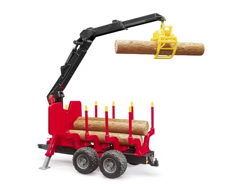 The Bruder U02252 Forestry Trailer with Loading Crane is a highly detailed 1:16 scale logging trailer designed for realistic timber‑handling play. It features a fully functional rotating and swivelling crane equipped with a working grapple for loading and unloading the included four tree trunks. The trailer comes with adjustable uprights to secure logs during transport, soft tread tyres, and an all‑terrain oscillating axle for smooth movement over uneven ground. A rear drawbar coupling allows attachment of additional equipment. Made from high‑quality ABS plastic, this durable forestry trailer is suitable for indoor and outdoor play for children aged 4 and up.